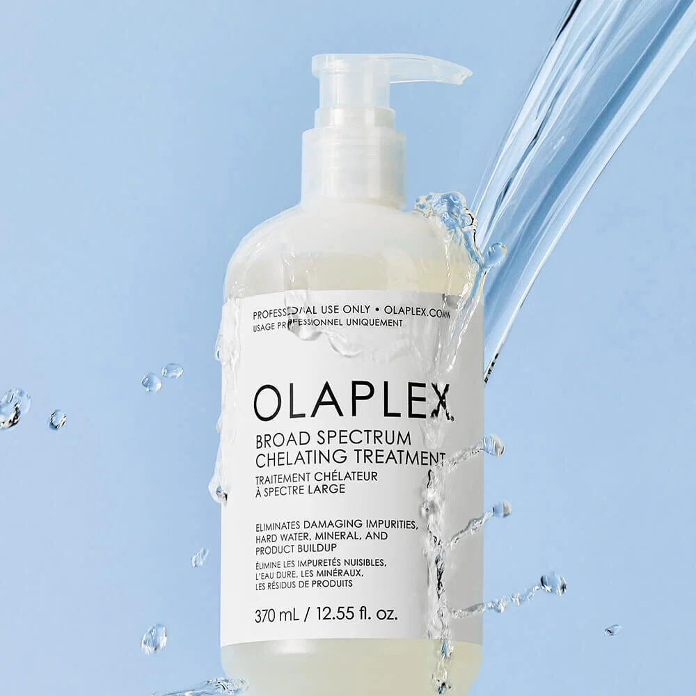 The Olaplex Broad Spectrum Chelating Treatment is a professional-strength, high-potency chelator that deeply cleans hair down to the cortex. With Patented Olaplex Bond Building Technology™, it supports strong bonds during the chelation process. The unique blend removes a wide range of heavy metals, minerals, pollution, chlorine, medications and product build-up without stripping hair of its moisture and essential proteins. The powerful broad-spectrum chelating blend achieves the deepest clarification to create a clean canvas for optimal results from other chemical services that can be compromised by build-up such as keratin treatments, colour and perms. It’s an essential corrective step for clients with build-up from hard water, well water, medications or discoloration from iron and copper deposits.